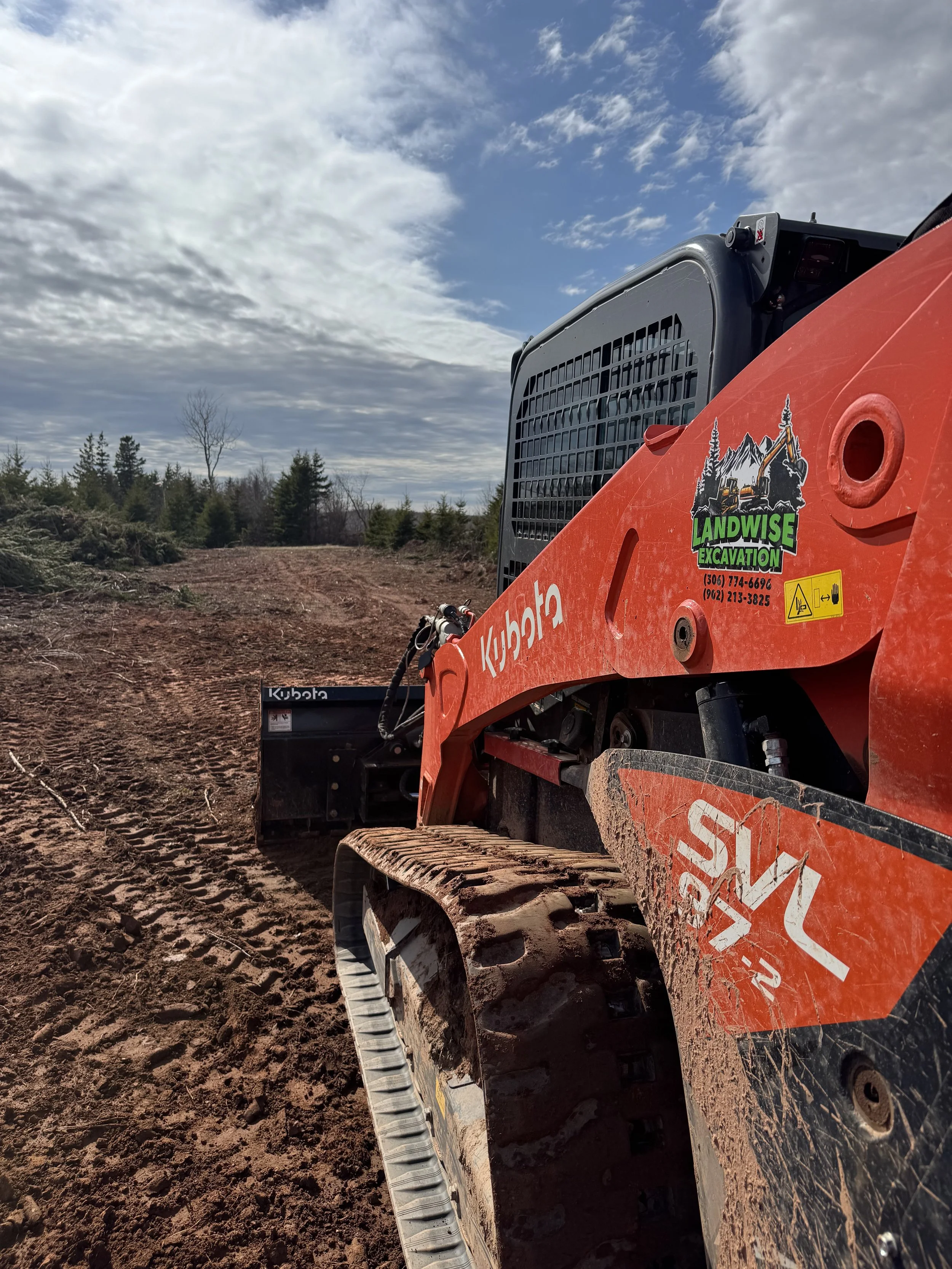 A red Kubota compact tracked excavator on a dirt construction site with plants and trees, under a partly cloudy sky.